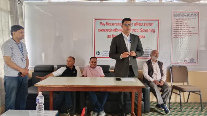 जिल्ला जनस्वास्थ्य कार्यालय, ललितपुरका प्रमुख डा।भुवन पौडेलले ‘मे मेजरमेन्ट मन्थ’ अभियान अन्तर्गत पत्रकारहरुको लागि नसर्ने रोगहरुको परीक्षणलाई जोड दिइएको बताए । उनले सूचना तथा समाचार सम्प्रेषणमा निरन्तर क्रियाशील पत्रकारहरुको स्वास्थ्यलाई ध्यान दिँदै यो शिविर आयोजना गरिएको बताए । ‘विश्वमा १० जनाको मृत्यु हुँदा ८ जनाको मृत्यु नसर्ने रोगबाट हुने गरेको तथ्यांक छ, त्यसैले नसर्ने रोगको जोखिम कम गर्न अनिवार्य भएको छ, स्वास्थ्य जाँच सबै नागरिकका लागि अति महत्वपूर्ण हो, त्यसमा पनि निरन्तर पत्रकारितामा लाग्नेहरुलाई स्वस्थ राख्नका लागि पनि पत्रकार महासंघको आग्रहमा हामीले यो शिविर राखेका हौं’डाक्टर पौडेलले भने ।