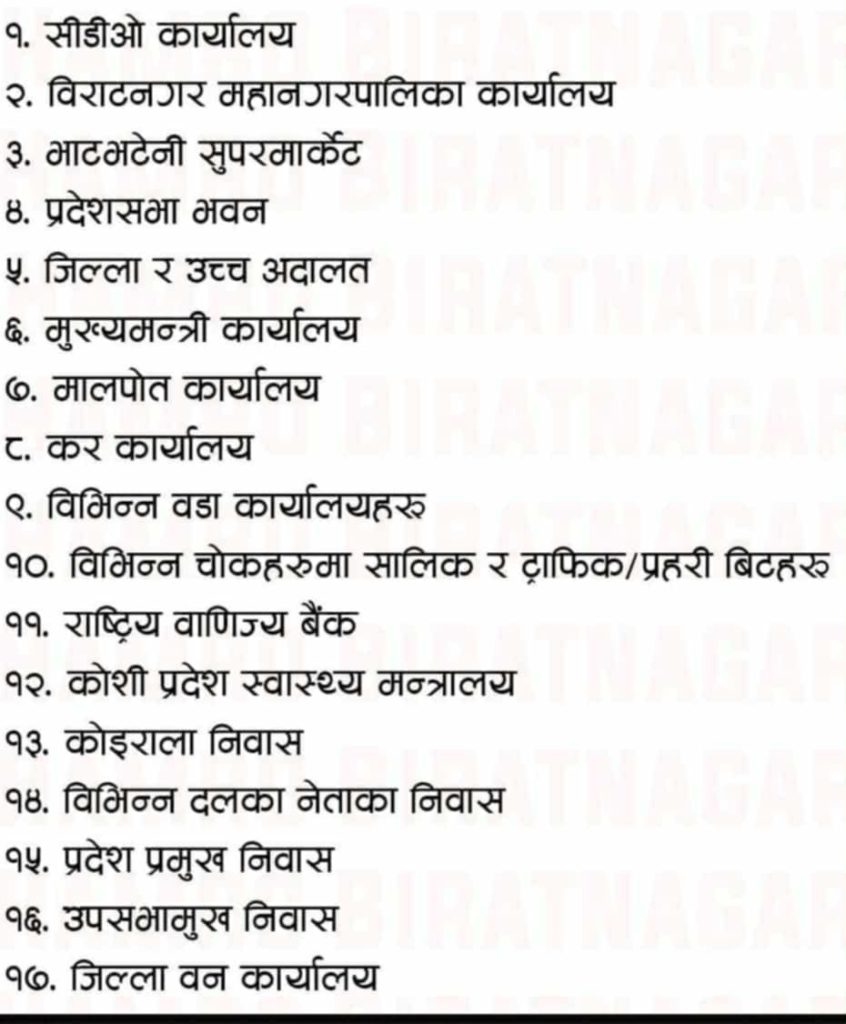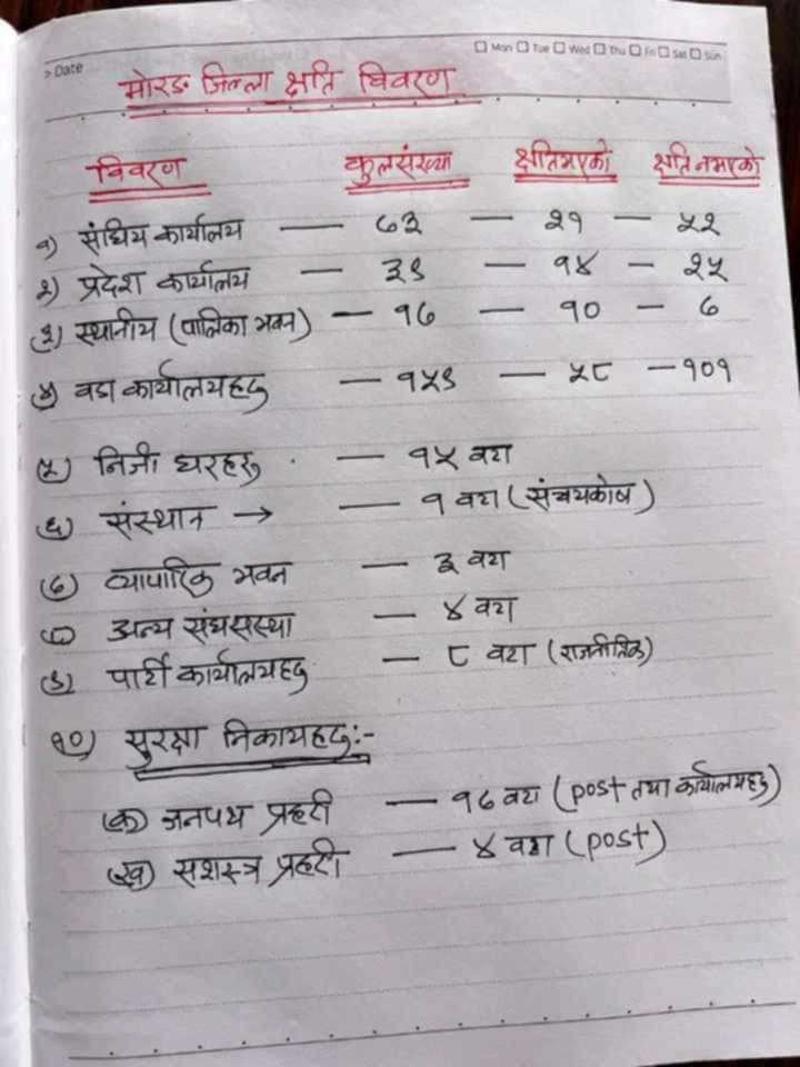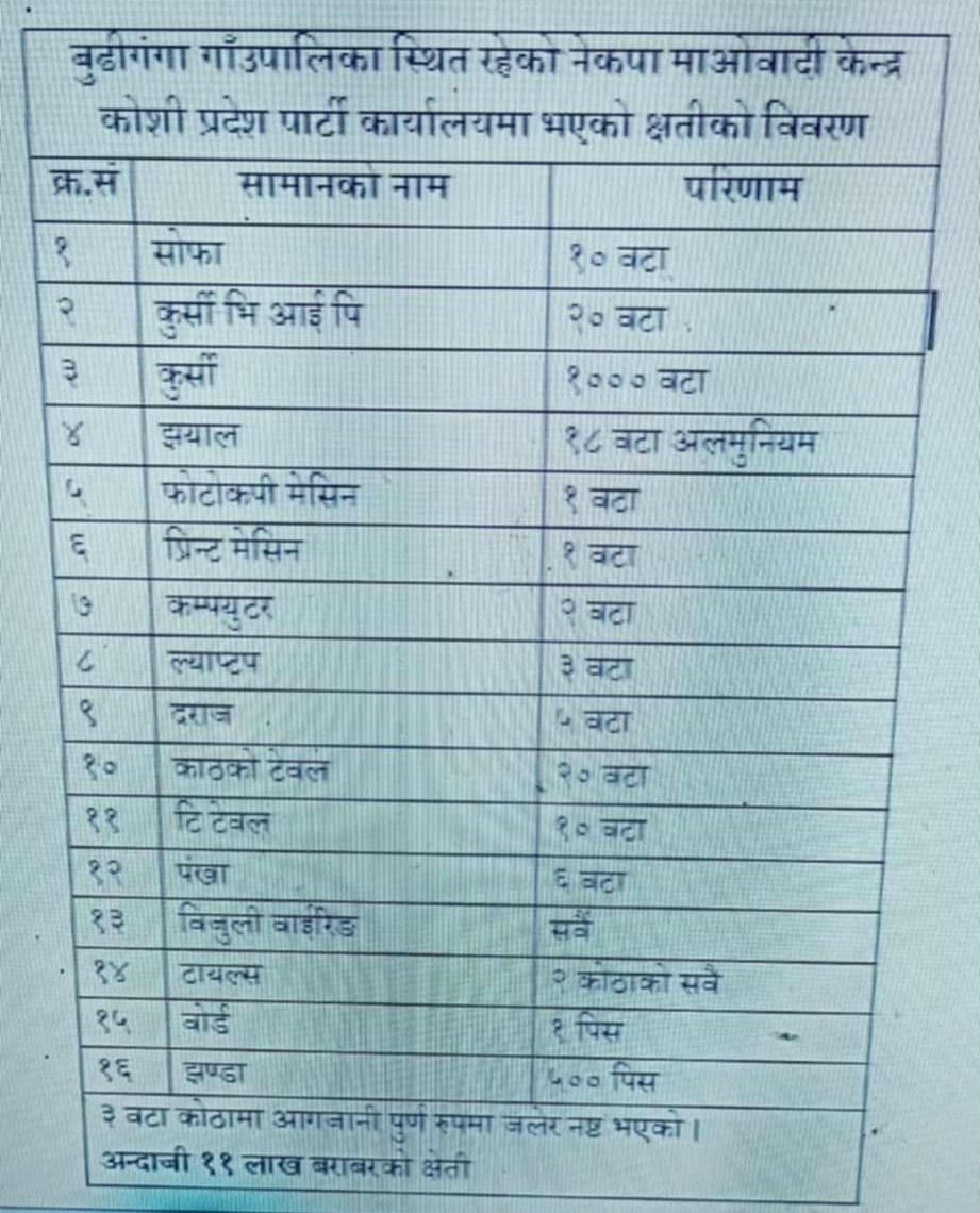 गाडी ३ मो सा ७ बिराटनगर म न पा ७ स्थित जिल्ला अदालत मोरङ (अगजनी) गाडि ९ मोसा ६१ बिराटनगर म न पा ७ स्थित उच्च अदालत मोरङ (आगजनी) गाडी २ मोसा ६ बिराटनगर म न पा १५ स्थित भन्सार कार्यालय रानी (आगजनी) गाडी ८ बिराटनगर म न पा ३ स्थित प्रदेश प्रमुख निवास (आगजनी) गाडी १ बिराटनगर म न पा ३ स्थित प्रदेश प्रमुख कार्यालय (आगजनी) गाडी ३ मोसा २ बिराटनगर म न पा १३ स्थित मुख्य मन्त्री कार्यालय (आगजनी) गाडी २ मोसा ७ बिराटनगर म न पा १३ स्थित मुख्य मन्त्री निवास (आगजनी) स्कुटर १ बिराटनगर म न पा ९ स्थित आन्तरिक राजस्व कार्यालय (आगजनी) गाडी ४ मोसा ७ #बिराटनगर म न पा १० स्थित आन्तरिक मामिला तथा कानुन मन्त्रालय ( आगजनी) आर्थिक मामिला तथा योजना मन्त्रालय (आगजनी) गाडी १ बिराटनगर म न पा १० स्थित कर्मचारी सञ्चय कोष कार्यालय (आगजनी ) मोसा ३ बिराटनगर म न पा १० स्थित को. ले. नि. का. ( आगजनी ) मोसा २ गाडी १ बिराटनगर म न पा १० स्थित भुमी ब्यवस्था कृषि तथा सहकारी मन्त्रालय ( आगजनी) गाडी ४ मोसा ३ बिराटनगर म न पा ७ स्थित बिराटनगर महानगरपालिका को कार्यालय ( आगजनी) गाडी २ मोसा ३ विराटनगर म न पा १३ स्थित पशु चिकित्सक प्रयोगसाला कार्यालय( आगजनी) गाडी २ विराटनगर म न पा को कार्यालय (आगजनी) गाडी ४ बिराटनगर म न पा ७ स्थित वडा कार्यालय ( आगजनी ) बिराटनगर म न पा ९ स्थित वडा कार्यालय (तोडफोड)