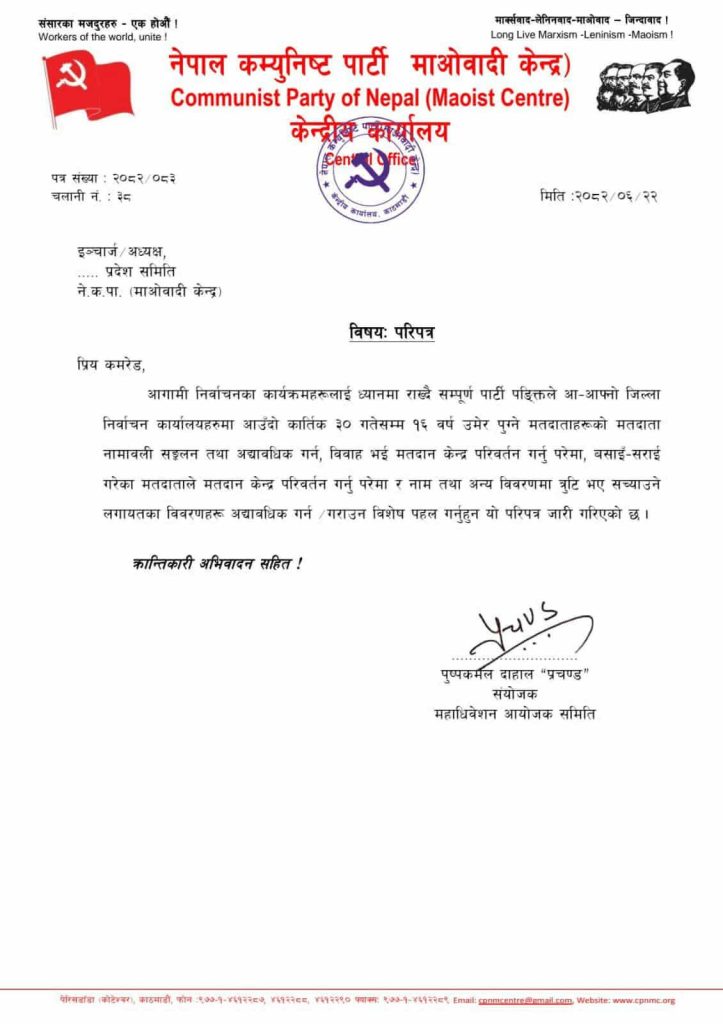 पार्टीका महाधिवेशन आयोजक समिति संयोजक पुष्पकमल दाहाल ‘प्रचण्ड’ द्वारा जारी गरिएको परिपत्रमा पार्टी कार्यकर्ताहरूलाई आगामी कार्तिक ३० गतेभित्र १६ वर्ष उमेर पुगेका नागरिकहरूको नाम समावेश गर्न, विवाह तथा बसाइँ सराइका कारण मतदान केन्द्र परिवर्तन गर्नु परेमा आवश्यक प्रक्रिया पुर्‍याउन, साथै नाम, जन्ममिति वा अन्य विवरणमा त्रुटि भएमा त्यसको सच्याउन पहल गर्न आग्रह गरिएको छ।