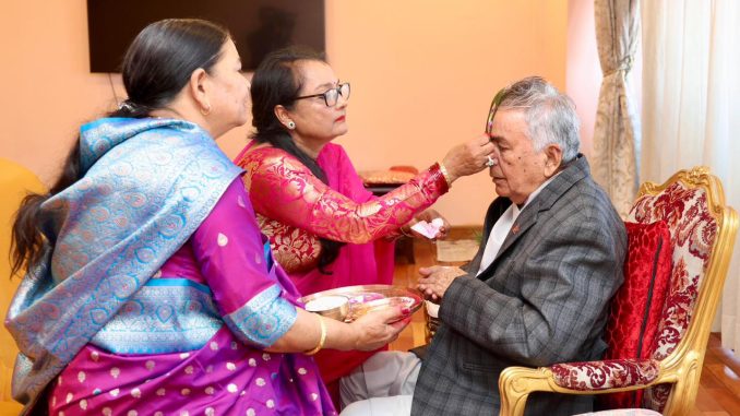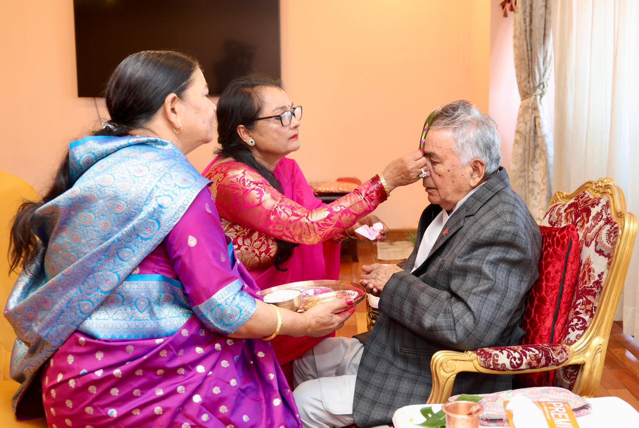 काठमाडौं । राष्ट्रपति रामचन्द्र पौडेलले बहिनीहरू शारदा पण्डित र चन्दा ओझाको हातबाट शुभसाइतमा यस वर्षको तिहारको टीका लगाउनुभएको छ।